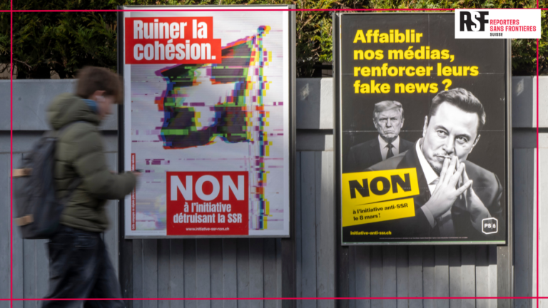 Votation “200 francs, ça suffit” : RSF s’engage pour la défense du service public audiovisuel en Suisse 16 février 2026 A la une, actualité, International, Suisse - Reporters sans frontières (RSF) affirme son engagement en faveur d’un “non” à l’initiative populaire “200 francs, ça suffit”. À travers cette prise de position, nous entendons rappeler le rôle central du service public de l’information en Suisse. Les citoyens sont invités à se prononcer le 8 mars prochain sur ladite initiative. Alors que le financement… En savoir +