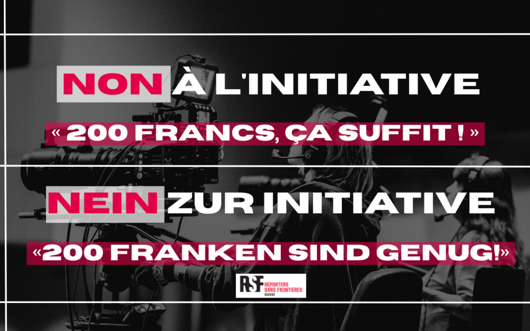 Le 8 mars, nous voterons sur l’avenir des médias suisses. L’initiative controversée visant à réduire de moitié le budget de la SSR aurait des conséquences lourdes pour le service public et le journalisme en Suisse. C’est pourquoi nous, RSF Suisse, rejetons catégoriquement cette initiative. Cinq arguments plaident en faveur d’un « non » clair le 8 mars. Le directeur général de RSF, le Franco-Suisse Thibaut Bruttin, sera par ailleurs au Club suisse de la presse à Genève, le vendredi 13 février prochain à 11h, pour dire l’importance que notre organisation accorde à ce scrutin (plus d’informations suivront).
